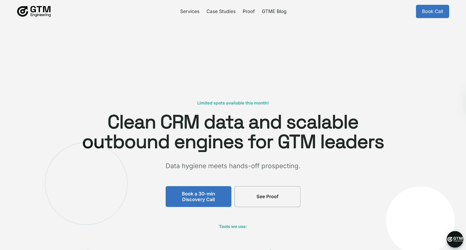 Ensure the agency specializes in your tech stack. If you're a HubSpot shop, don't hire a Salesforce-exclusive consultancy. You need a team with proven expertise in your tools. For example, GTM Engineering is known for its expertise in Clay.