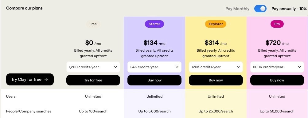 Plan Requirement | Clay Pro ($800/month or 10% discount paying $8.6k annual) |