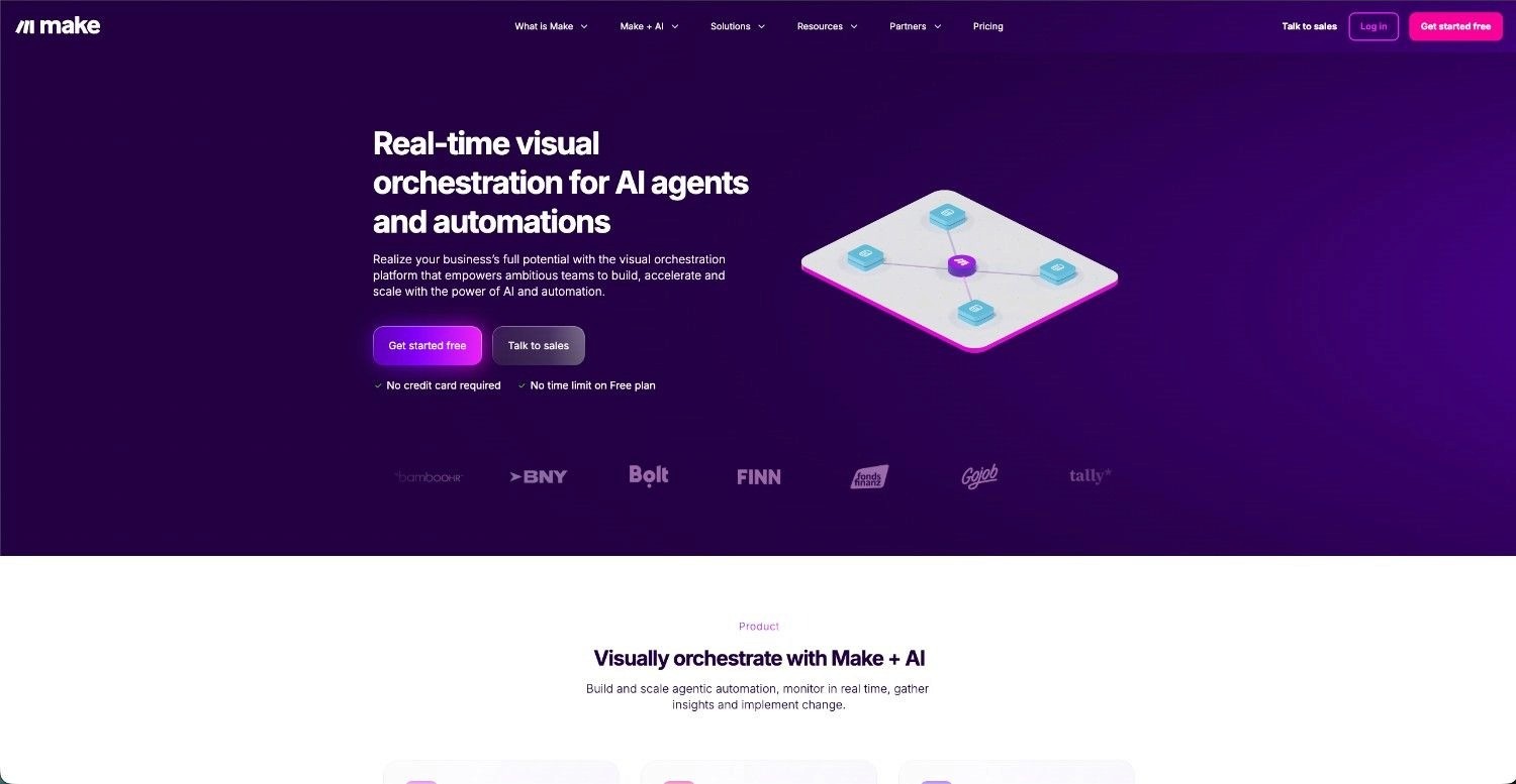 Make.com positions itself between Zapier's simplicity and n8n's flexibility. The platform uses a visual node-based builder where you drag boxes and connect them, making complex logic visible and intuitive. Make.com supports 1,000+ integrations and handles complex workflows better than Zapier.
